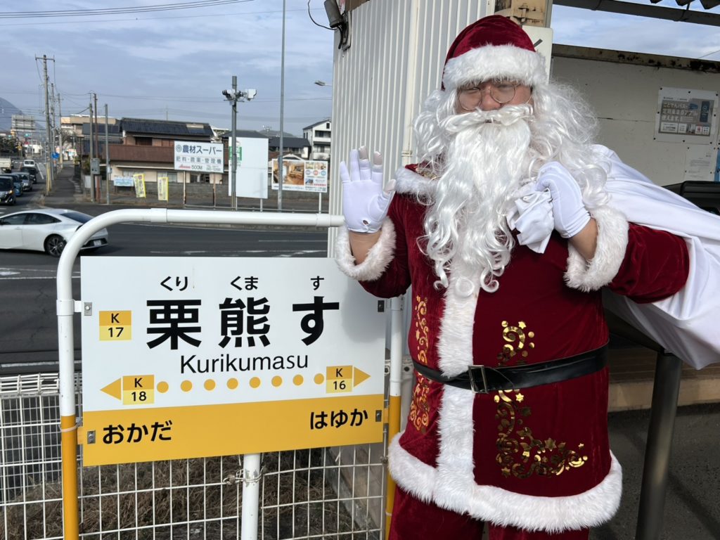 ・今年も栗熊駅に「す」が付く季節になりました 2025.12.23 今年も栗熊駅に「す」が付く季節になりました。栗熊駅では、クリスマスの時期にあわせて、駅名を「栗熊す駅」と表示する取り組みが今年も行われています。駅名板は期間限定の表記となっており、クリスマス当日まで見ることができます。日頃利用している駅のちょっとした変化として、通勤・通学やお出かけの際に気づいていただければと思います。お近くにお越しの際は、ぜひご覧ください。 訪問者数 32