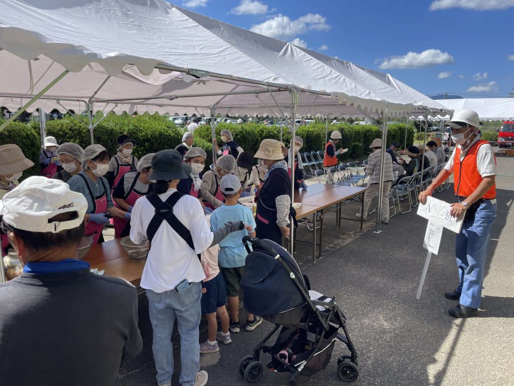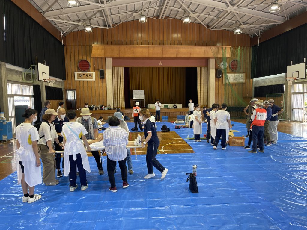 栗熊校区自治会より子どもも含めて74名の参加者と、日本赤十字社・飯山高校看護科学生・第14消防団・コミュニティ部員等の協力のもと行いました。