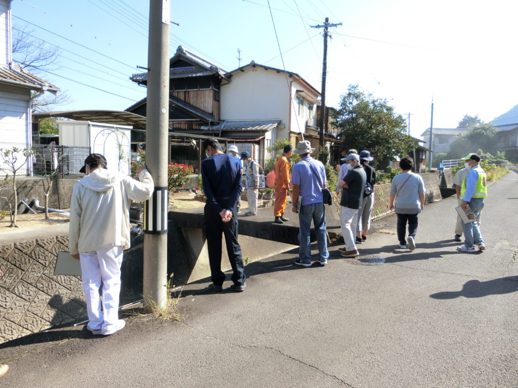 自主防災会では南海トラフ大地震・大雨によるため池決壊など大規模災害発生時における安全・危険個所を地元の自治会の方々の協力を得て「まち歩き」により地区の総点検を始めました。