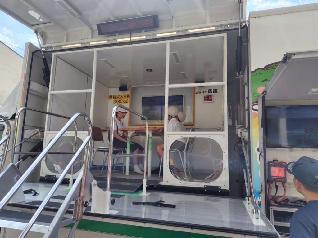 | ➂ 起震車による地震体験 体育館外の西側において、震度をだんだんと上げ6強にしたときの揺れを体感、 固定された柱につかまらないと体が飛ばされそうになるほどの揺れを体感しました。 |