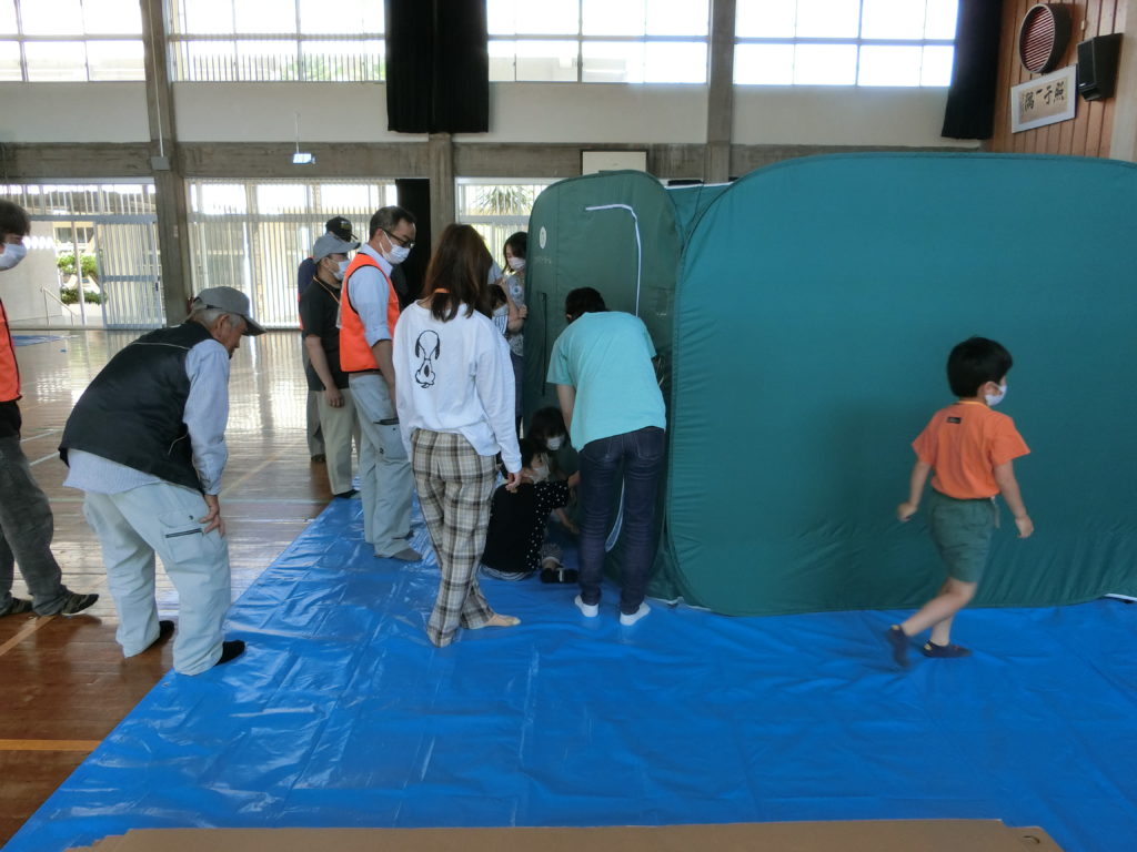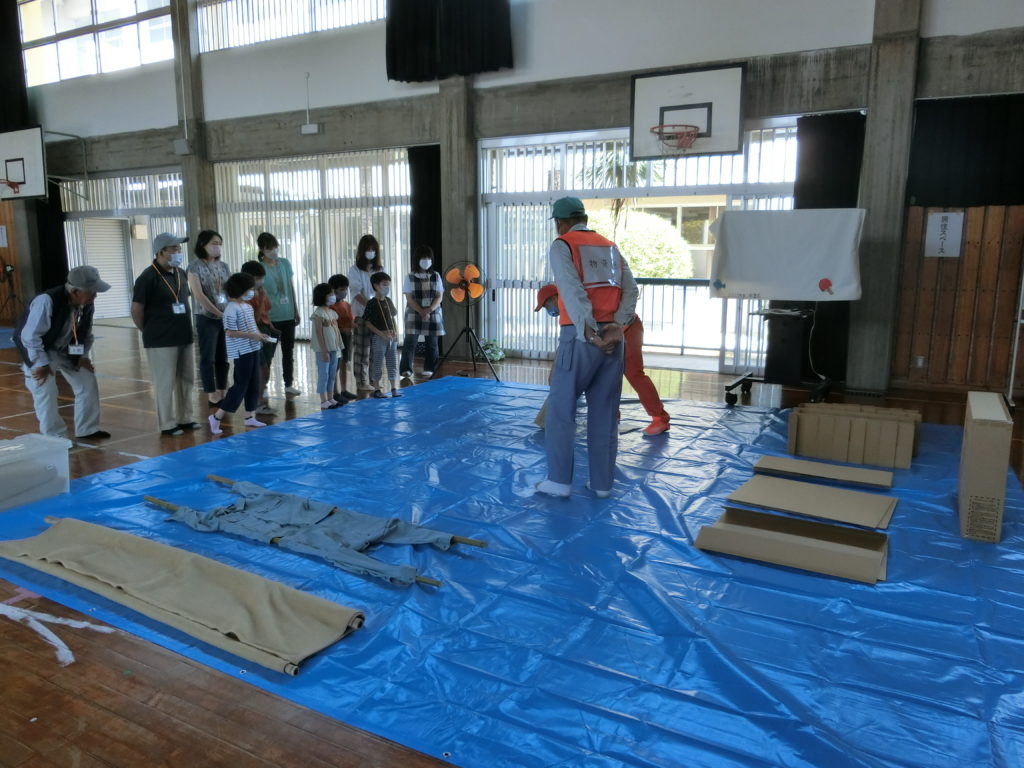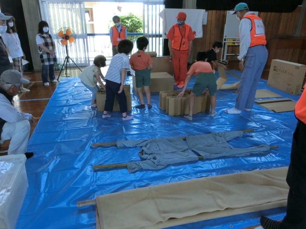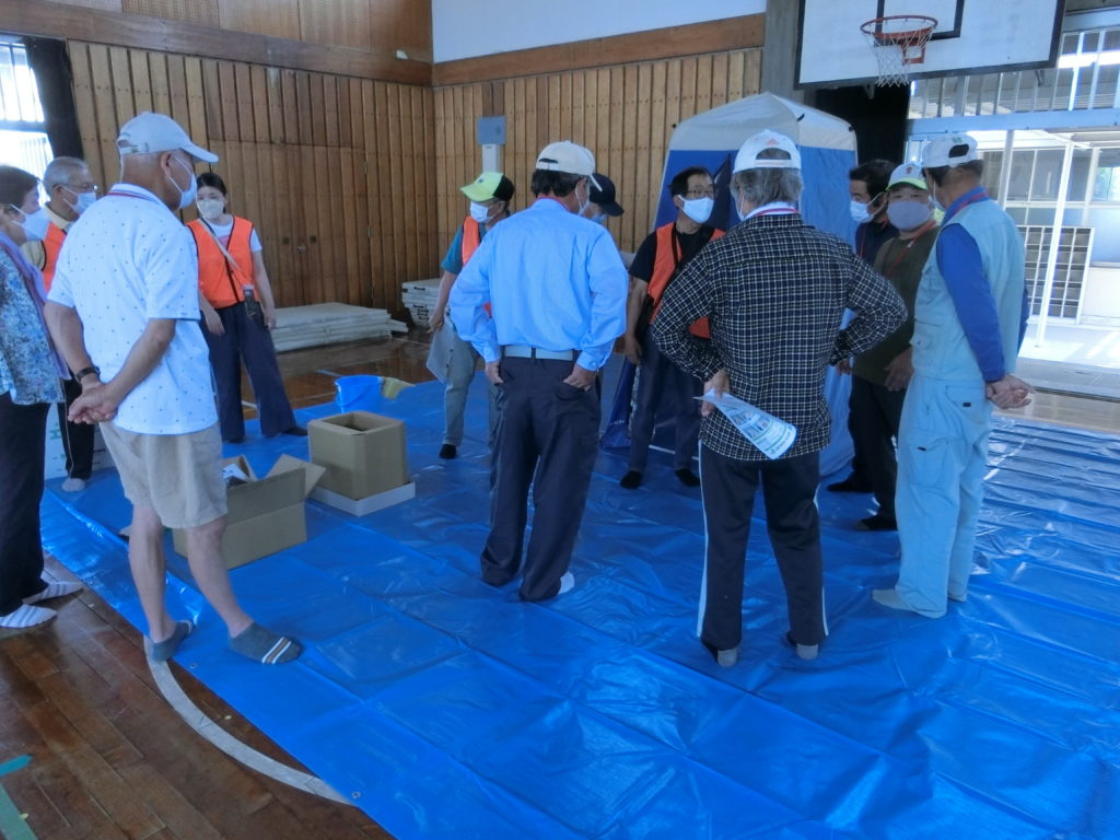 | (3) 訓練内容 | ➀避難移動 自宅から避難所まで経路の安全を確認しながら徒歩で避難。 ➁受付 コロナ禍での感染症対策のため、検温等をして受付。 ➂避難所運営 パーテーション、段ボールベット、簡易トイレの組み立てと使用方法の確認。(栗熊小学校では簡易担架の作り方も実践) |