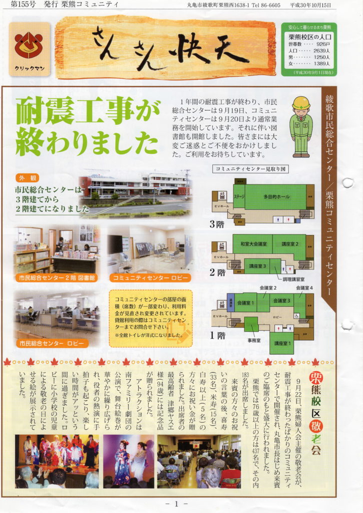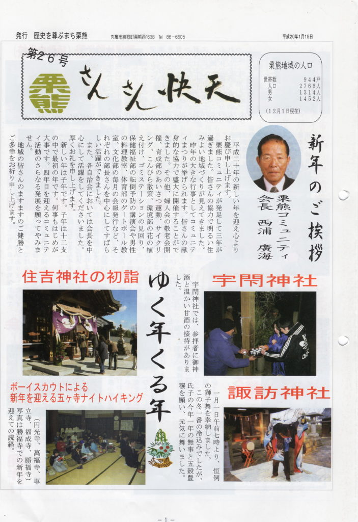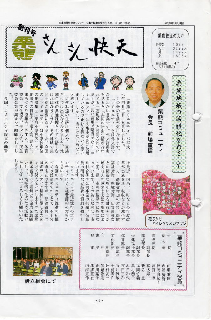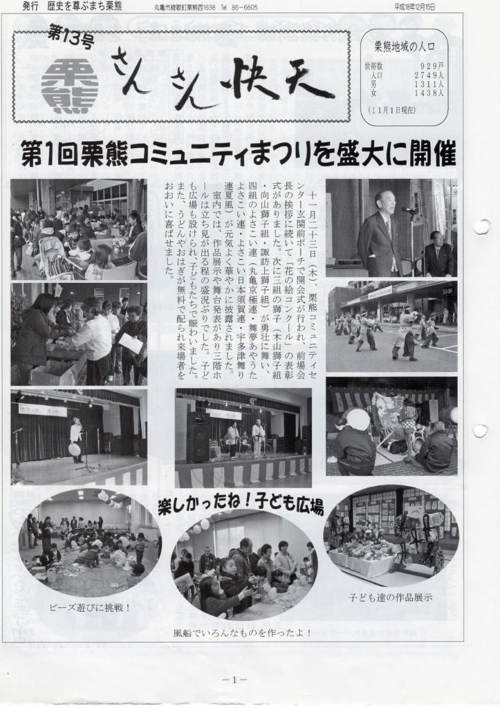 平成17年4月の旧丸亀市との合併を機に栗熊コミュニティができました。そして、その中の組織のひとつとして文化部が創設され、「さんさん快天」を発行することになりました。